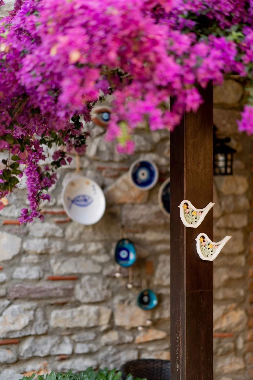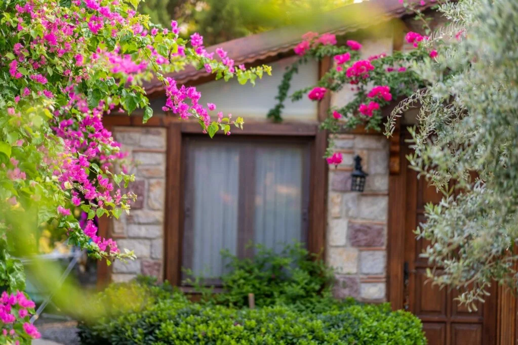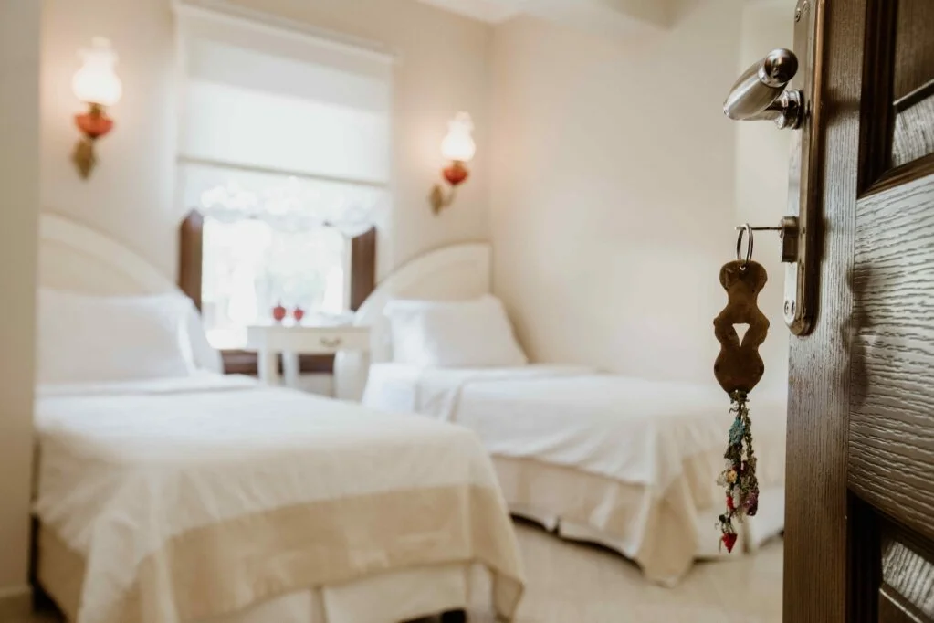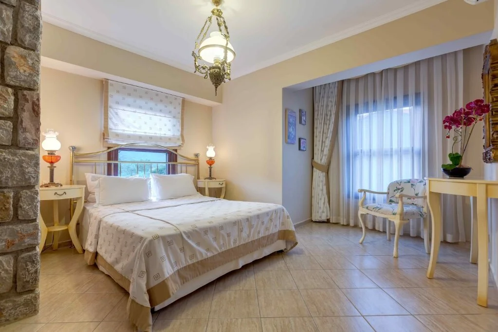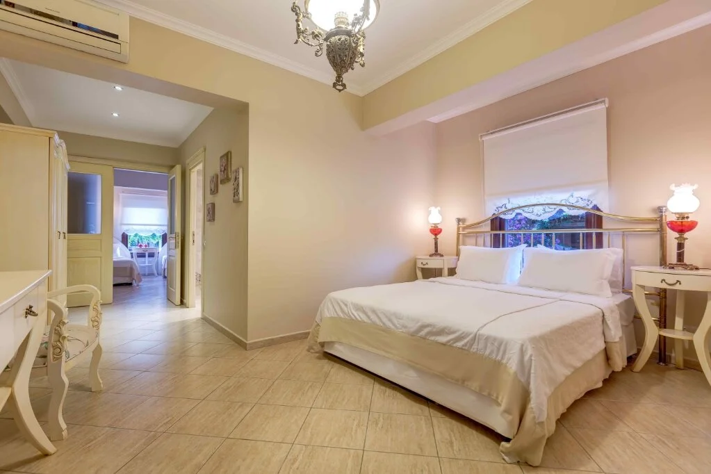 Luna Begonvil Taş Evler'in açık renklerde zevkli bir biçimde dekore edilmiş odalarının tasarımları birbirinden farklı.